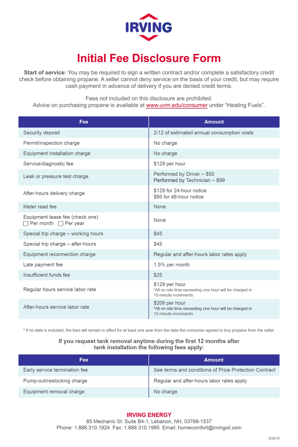 Fees: Applicable fees related to your propane service are detailed in the Irving Energy Fee Disclosure Form included at the end of this Agreement.